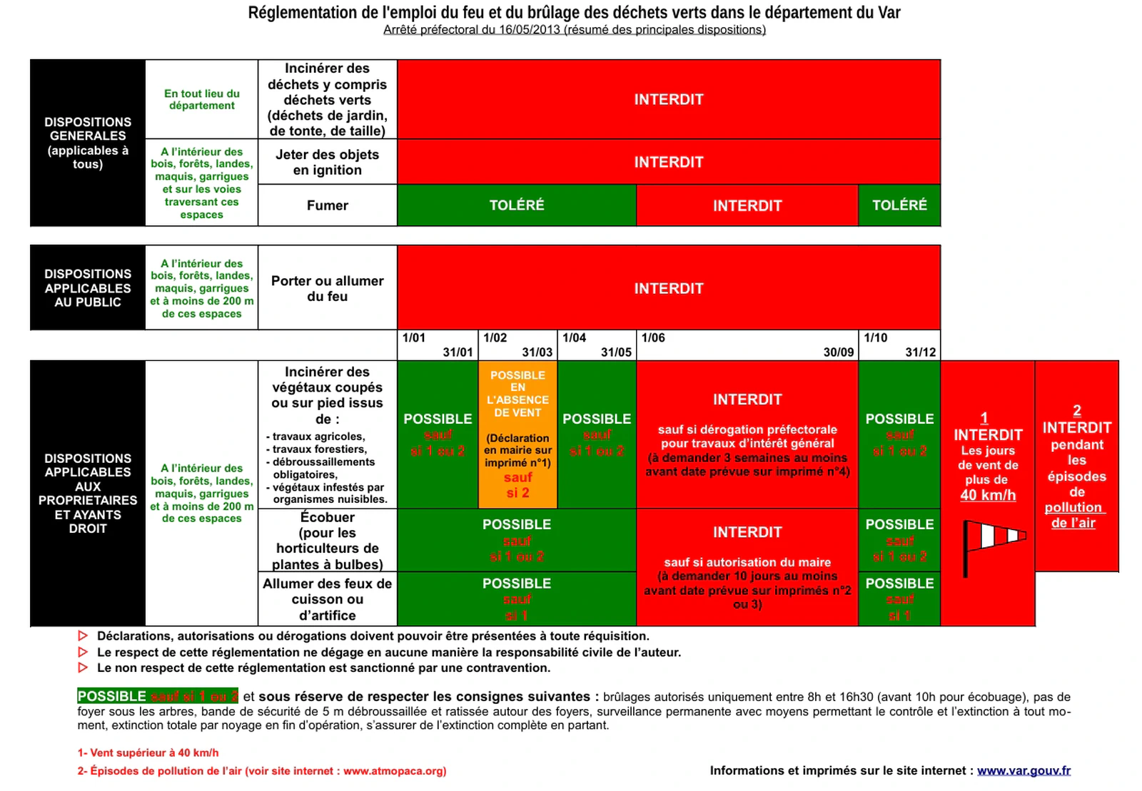 - Période ROUGE (juin-septembre) : Brûlage totalement interdit (contravention de 4ème classe)