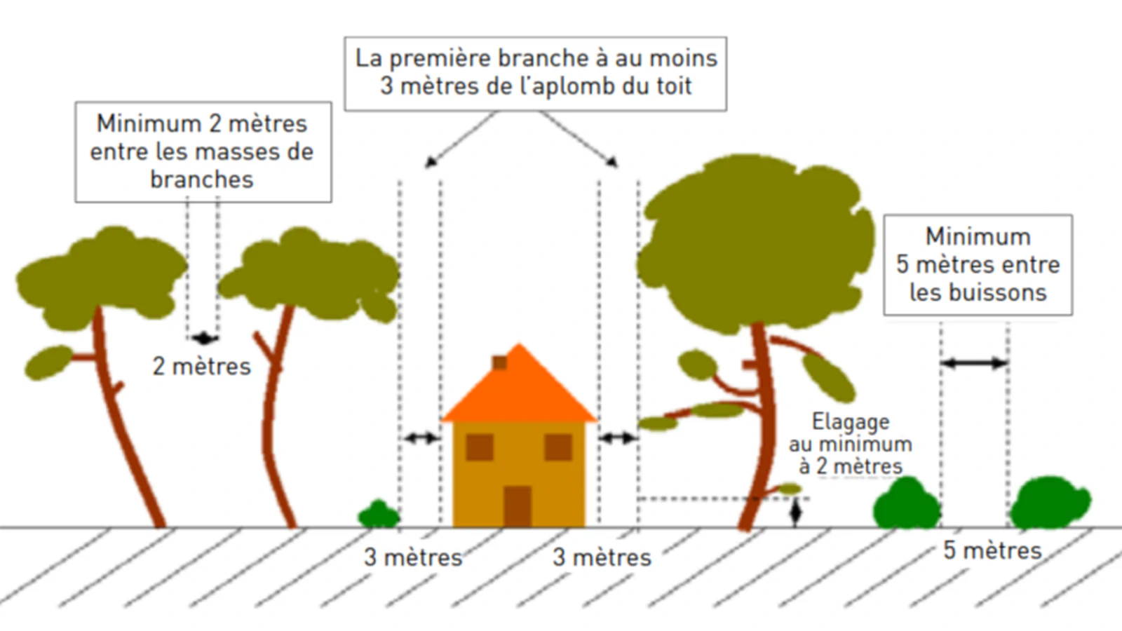- 3 mètres minimum entre les premiers feuillages des arbres et votre habitation